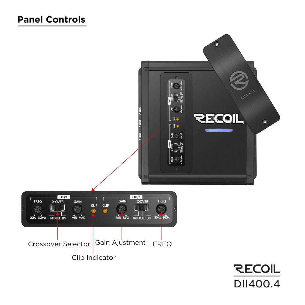Don’t let Recoil DII series amp’s modern styling and small size fool you though, Utilizing the latest Class-D technologies, the ultra-compact DII series amplifiers are engineered to deliver loads of audio output power, with incredible efficiency. For your convenience, the DII amps’ controls can be found on top of the amplifier, beneath a protective cover.