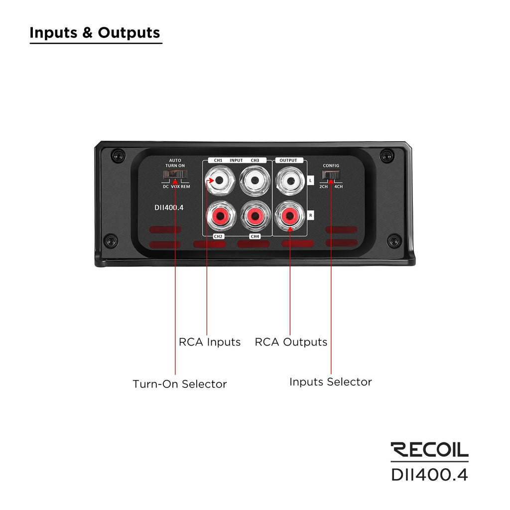 The Recoil DII400.4 is an impressive Class-D 4 Channel car amplifier, delivering a robust 800 watts of power. It features an efficient design that is capable of producing 100 watts per channel at 2 ohms, making it suitable for a variety of car audio systems. This amplifier is equipped with a MOSFET power supply for enhanced performance and stability