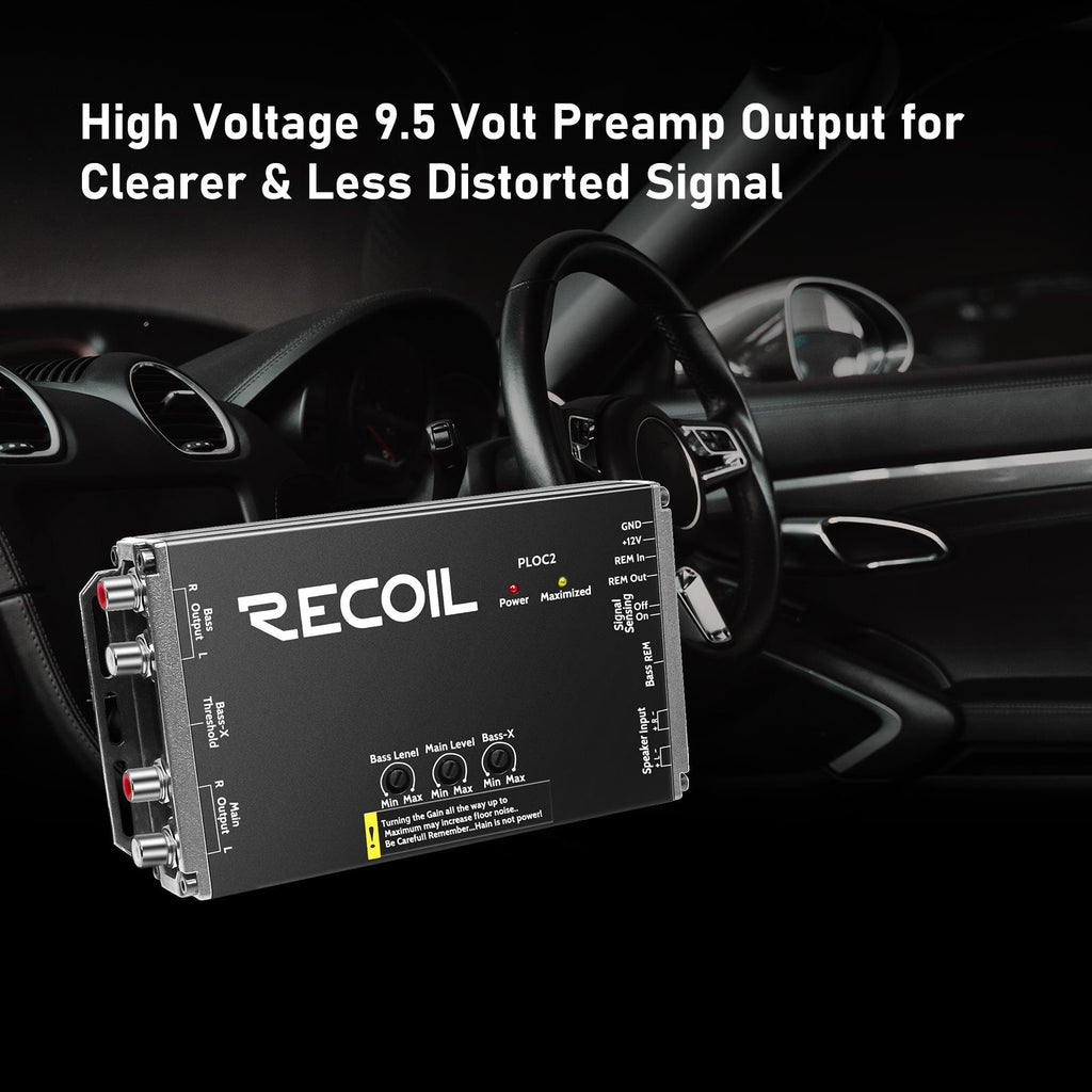 Recoil’s PLOC2 is a compact 2-channel line output converter with active input circuitry, which allows it to accept speaker-level signals of up to 400 watts per channel from factory-installed source units or amplifiers. It converts them to high-quality pre-amp signals that can then be directed to after-market amplifiers.