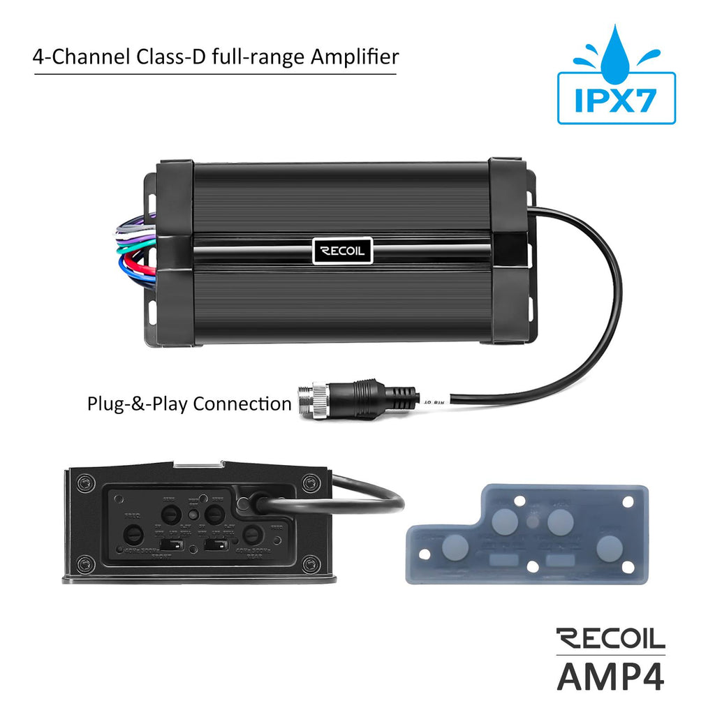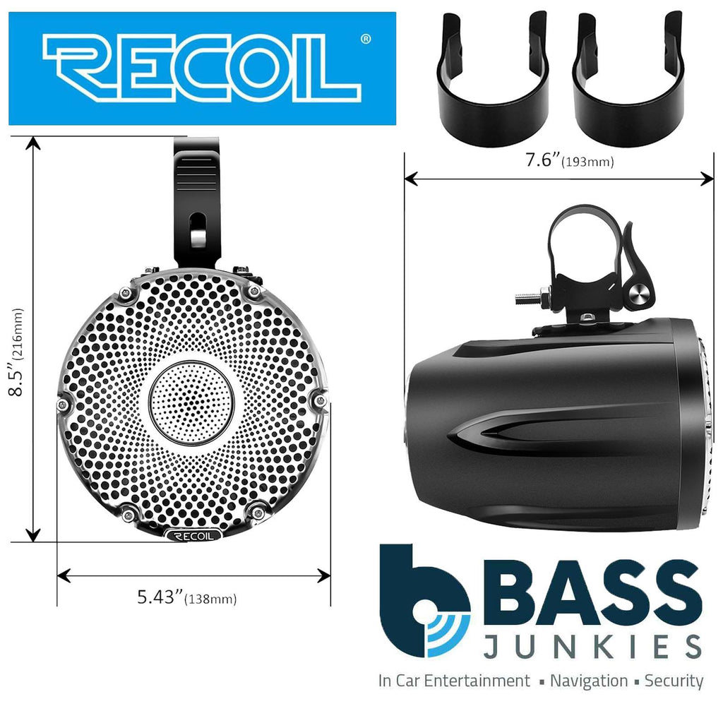 - Pair of Recoil R4 speakers featuring a 3" passive radiator in the back of the pod for an increased bass experience.