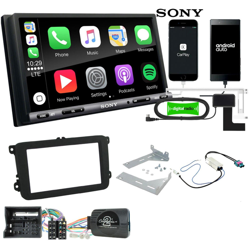 Sony XAV-AX3250 Car Stereo (17.6cm) 6.95" Touch Screen Double Din Bluetooth | USB | DAB+ Radio | FM Radio | Apple CarPlay | Android Auto | Rear view camera ready | Anti-Glare Screen + VW MIB-PQ Double Din Installation Kit. Supplied With Black Double DIN Fascia, Steering Wheel Control Interface, Twin FAKRA Antenna Adapter & Universal Patchlead