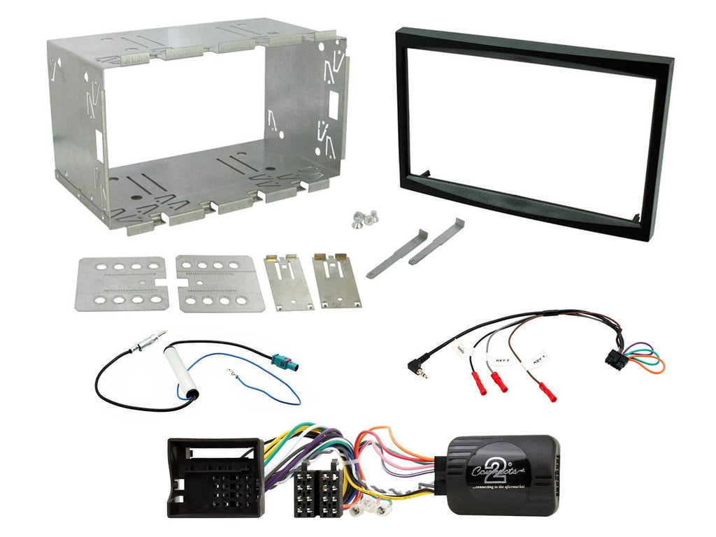 Vehicle specific Peugeot Installation Kit. Supplied With Black Double DIN Fascia, Steering Wheel Control Interface, FAKRA Antenna Adapter & Universal Patchlead