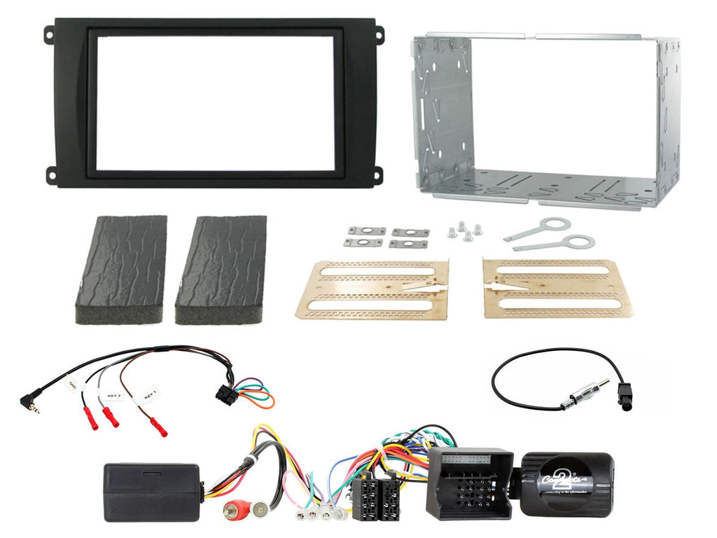 Vehicle specific Complete installation kit for Porsche Cayenne vehicles with separate fibre amp and PCM3 system - includes double din fascia, steering wheel control, antenna adapter and universal patchlead.